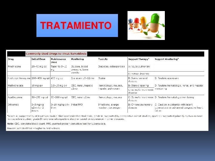 El tratamiento inicial consiste en la administración de glucocorticoides (No existe consenso respecto al inicio, duración, dosis e indicaciones. ) En el estadio I no está indicado el tratamiento. En los estadios II y III se instaura tratamiento si hay sintomatología y/o alteraciones funcionales respiratorias; o aun no existiendo lo anterior se observa progresion radiológica de la enfermedad. En el estadio IV deben tratarse todos los pacientes.