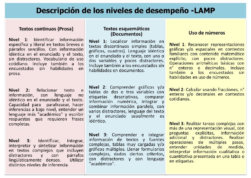 2 - PROGRAMA DE EVALUACIÓN Y MONITOREO DEL ALFABETISMO - LAMP 2011 Objetivo del Estudio Evaluar las habilidades de la población paraguaya de 15 años y más en la lectura de textos continuos (prosa), textos esquemáticos (documentos) y en el manejo de números (números). Método Estudio que combina pruebas cognitivas y cuestionarios utilizando la plataforma de encuesta de hogares. Muestra nacional de 3. 966 participantes.