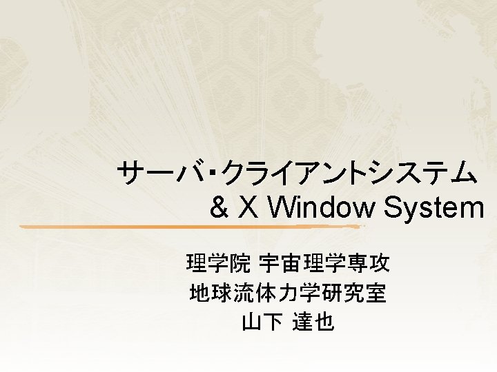 参考文献 u u 松田晃一・暦本純一著, アスキー出版局, 入門 X Window 山口和紀 古瀬一隆 監修, 技術出版社, 新 The UNIX Super Text [ 上] 武藤健志 著, 翔泳社, 改訂版 「 Debian GNU/Linux 徹底入門 -Sarge対 応-」 大見嘉弘, 永井保夫, 2007: 東京情報大学 2007年度システムプログラミ ング・演習第2講 HTTP プロトコル, u u X の歴史 u u http: //www. x. org/ Afterstep の画像 u u http: //homepage 3. nifty. com/rio_i/lab/xlib/019 history. htm X. org Foundation u u http: //www. rsch. tuis. ac. jp/~nagai/SYS 02. html http: //www. afterstep. org/screenshots/Stormy_Skies. jpg X サーバと X クライアントの画像 u http: //itpro. nikkeibp. co. jp/article/COLUMN/20060518/238369/? SS=imgvie w&FD=3561930&ST=oss
