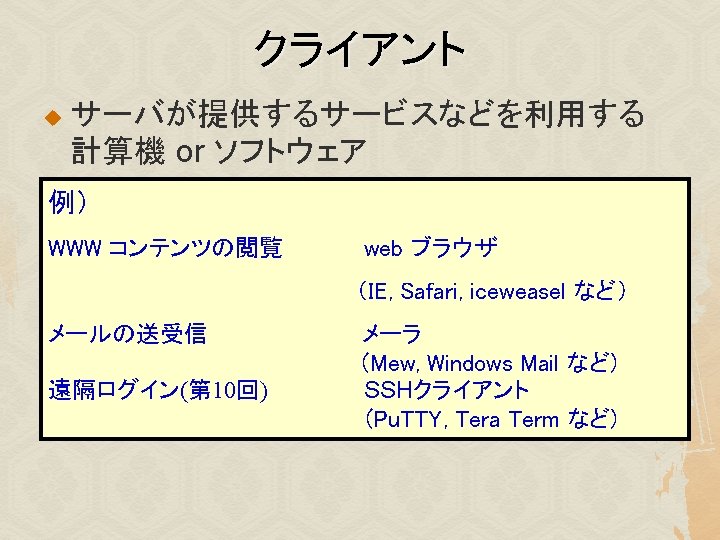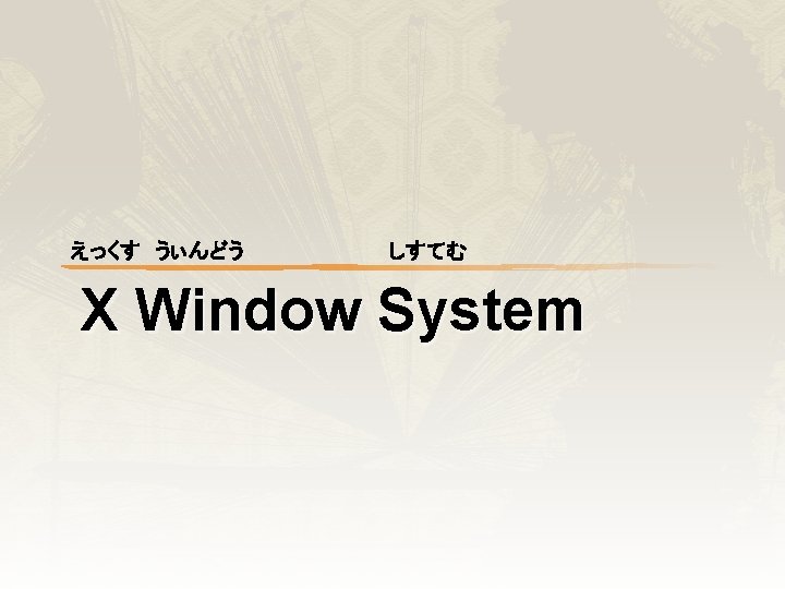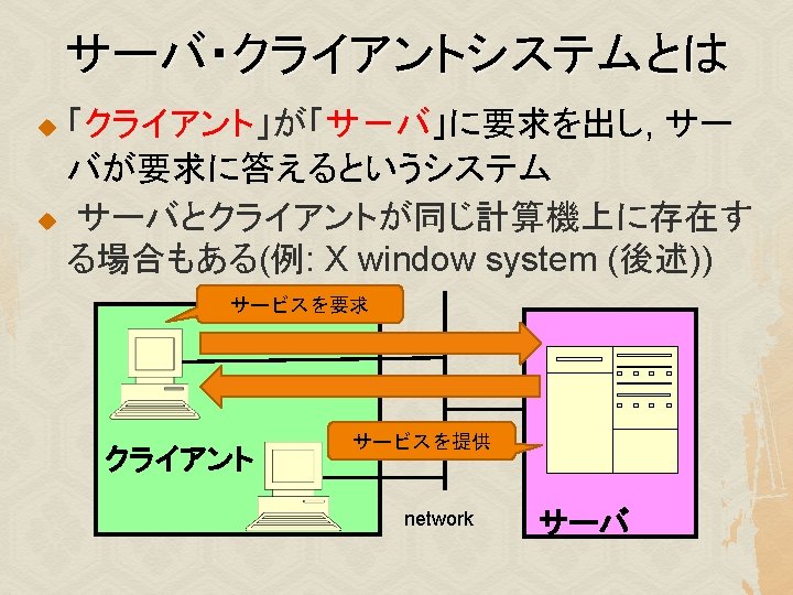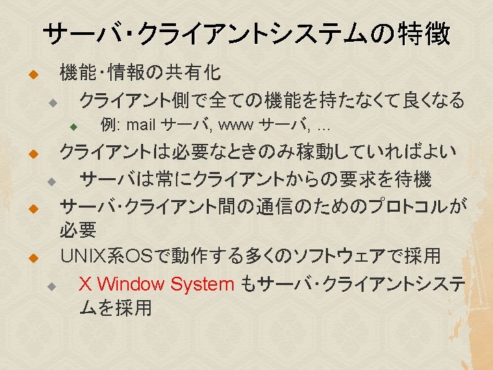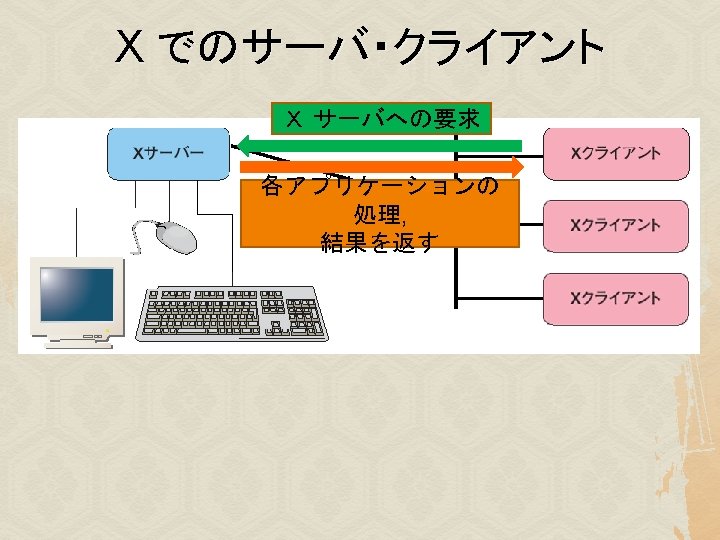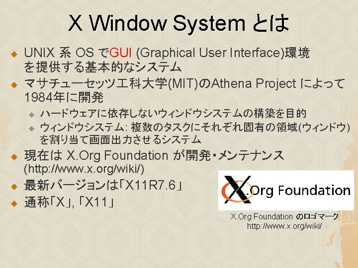 様々な X クライアント u xterm, kterm, mlterm: 端末(terminal) xeyes: マウスカーソルの追跡 xlogo: Xのロゴ表示 xclock: 時計 xcolors, xfontsel: 色・フォントの一覧表示 xcalc: 電卓 u その他 u u u u emacs, iceweasel xpenguins, xsnow, xcalendar, tuxeyes …