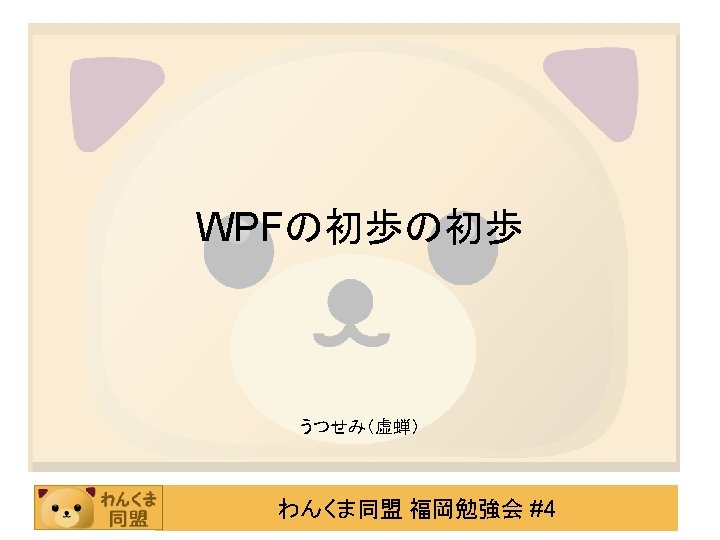XAMLを見てみよう • どちらも同じものです。(Button) XAML <Button Name=“btn. A” Content=“ボタン” Width=“ 200” Height=“ 25” /> C# Button btn. A = new Button(); btn. A. Content = "Click!"; btn. A. Width = 200; btn. A. Height = 25; this. Content = btn. A; 簡単になりましたよね? わんくま同盟 福岡勉強会 #4