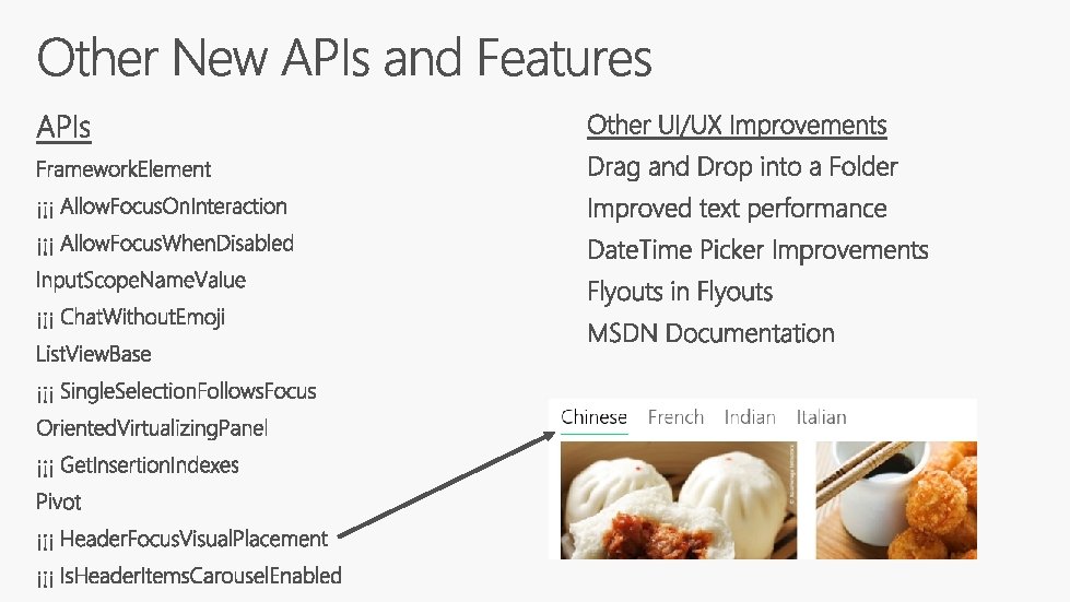 <!– ALT + O will invoke the Button --> <Button Content="Open" Click="Open. Cmd" Access. Key="O" Access. Key. Display. Dismissed="On. Dismissed" Access. Key. Display. Requested="On. Displayed"/> // Display UX Affordance (not required) private void On. Display(…) { // If desired: show all commands and UX affordance // Example: show tooltip and hide in “On. Dismissed” handler var tooltip = Tool. Tip. Service. Get. Tool. Tip(sender) as Tool. Tip; … }
