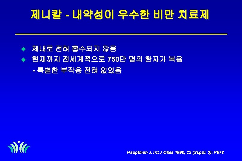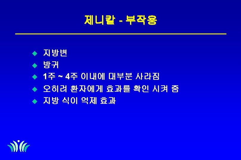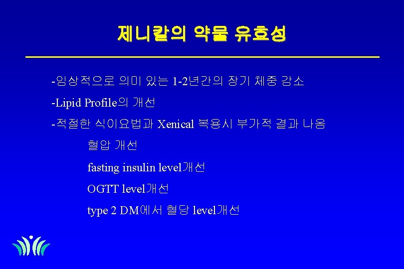 콜레스테롤 감소 효과 평균 변화량 (%) 대조군 +5 제니칼 120 mg p<0. 001 0 - 4. 6% -5 -10. 1% -15 -4 0 12 24 36 52 주 Davidson MH, et al. JAMA 1999: 281: 235 -42
