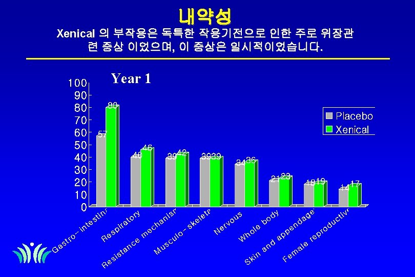 부작용 발생 빈도(1년 vs 2년) Year 1 Year 2 Xenical (%) Placebo(%) Xenical(%) Placebo(%) Oil spotting 26. 6 1. 3 4. 4 0. 2 Flatus with Discharge 23. 9 1. 4 2. 1 0. 2 Fecal Urgency 22. 1 6. 7 2. 8 1. 7 Fatty/Oily Stool 20, 0 2. 9 5. 5 0. 6 Oily Evacuation 11. 9 0. 8 2. 3 0. 2 Increased Defecation 10. 8 4. 1 2. 6 0. 8 7. 7 0. 9 1. 8 0. 2 Fecal Incontinence