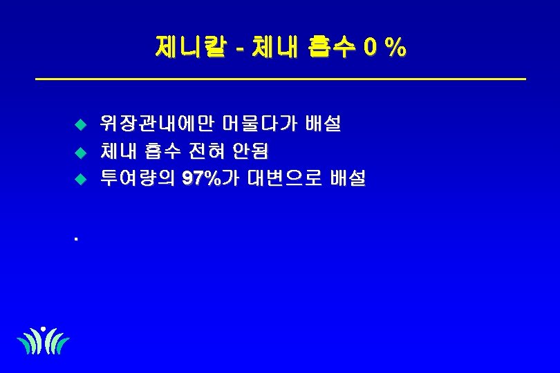 제니칼 Contraindication, Warnings and Precautions u u u Contraindication: Chronic malabsorption syndrome이나 cholestasis 환자 Hypothyroidism 과 같은 기질적 문제의 비만 환자에게는 처방할 수 없습니다. 제니칼은 임신중이나 수유중 복용이 장려되 지 않습니다.
