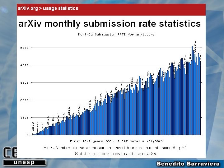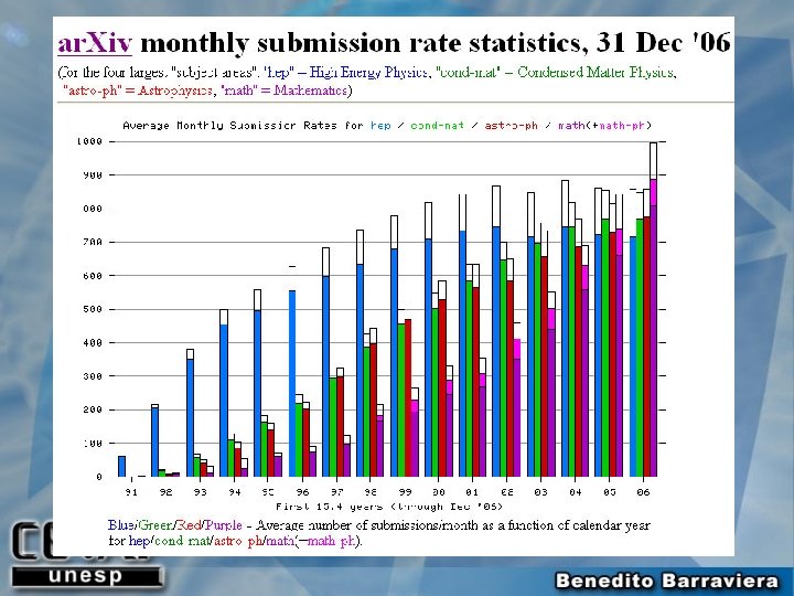Agosto de 1991 Paul Ginsparg – Físico da Los Alamos National Laboratory da Cornell University Califórnia – USA fundou a Los Alamos e-print archives Site atual - http: //arxiv. org Missão: distribuir automaticamente, por meio eletrônico, “papers” para atender as áreas de Physics, Mathematics, Computer Science, Quantitative Biology and Statistics.