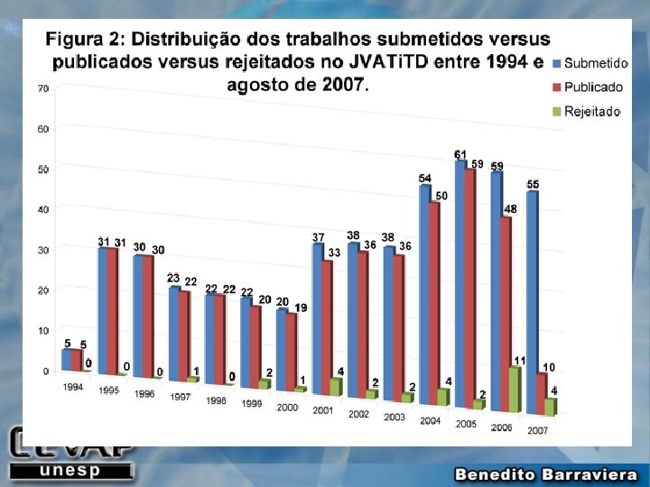 CONCLUSÕES Distribuição em disquetes inclusos em capa dura entre 1995 e 1999. Distribuição pela Internet em 1996 – www. botunet. com. br/cevap Distribuição pelo Sci. ELO a partir de 1998 – www. scielo. br/jvat Distribuição em CD-Rom entre 2000 e 2002. Distribuição pela Internet desde 1996, pelo Sci. ELO a partir de 1998 e utilizando o próprio site (www. jvat. org. br) a partir de 2003. Periodicidade semestral entre 1995 e 2003. Periodicidade quadrimestral em 2004. Periodicidade trimestral a partir de 2005. Classificação CAPES – (Avaliação 2004 – 2006) Nacional: Qualis A em Medicina II, Medicina Veterinária, Multidisciplinar, Odontologia, Farmácia e Zootecnia/Rec. Pesqueiros Internacional: Qualis A em Medicina III e B em Ciências Biológicas I