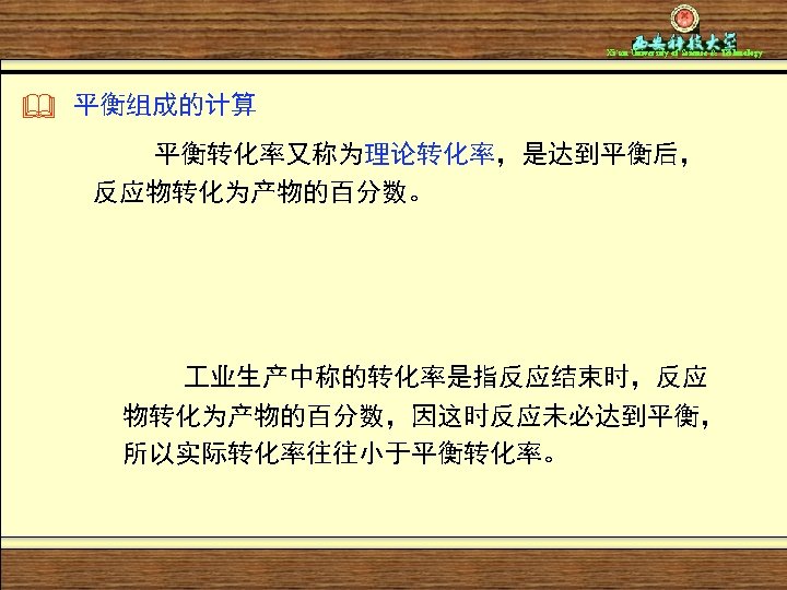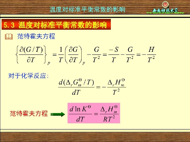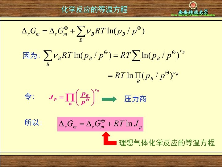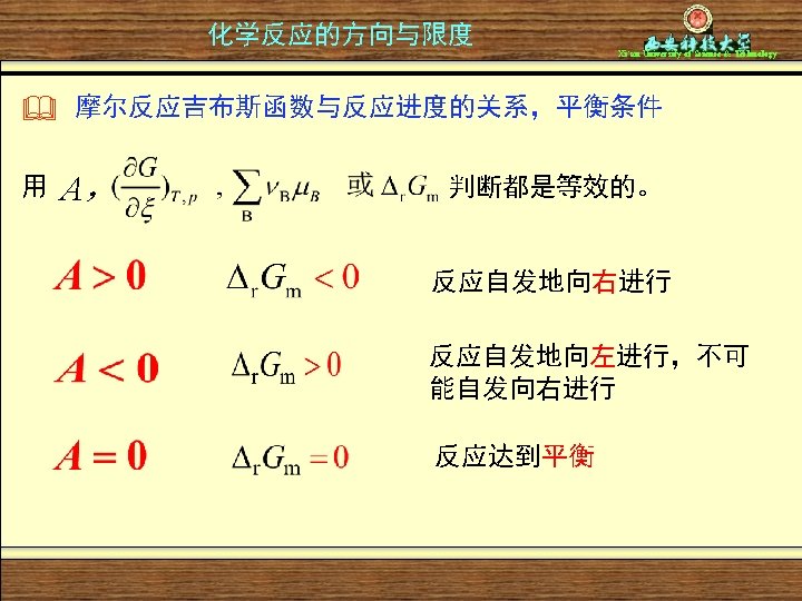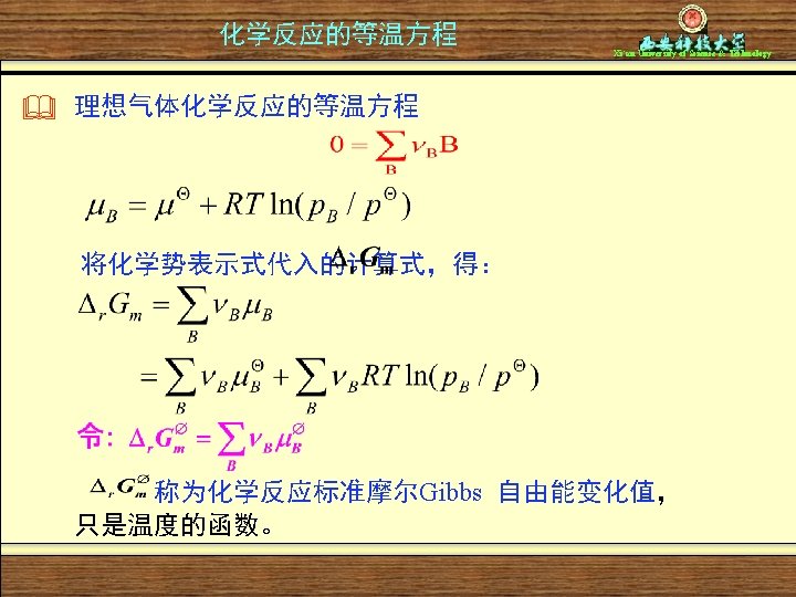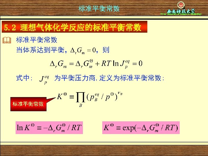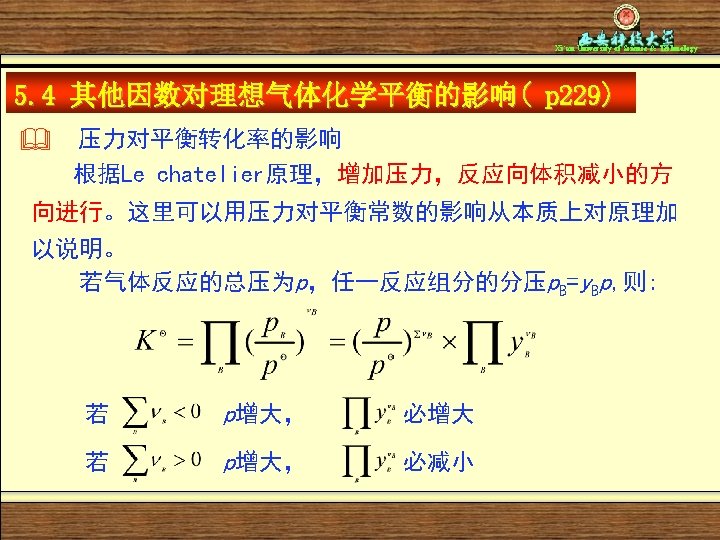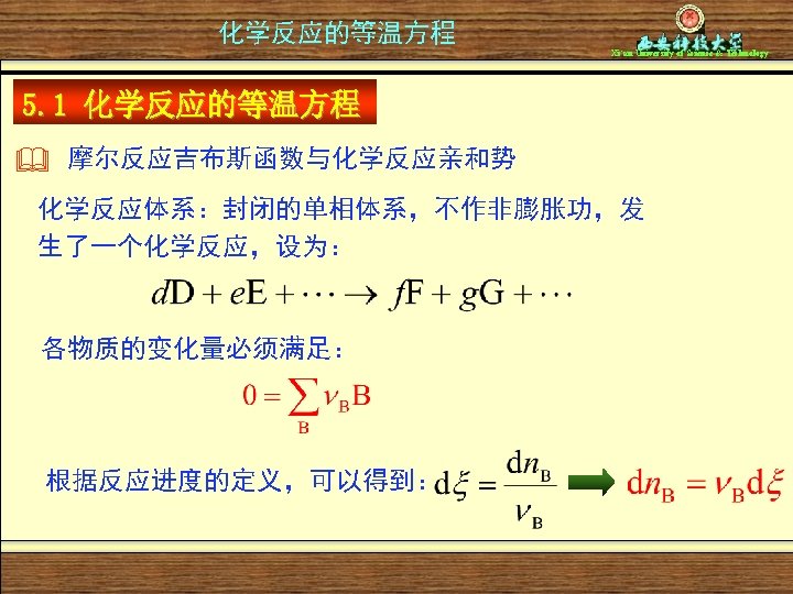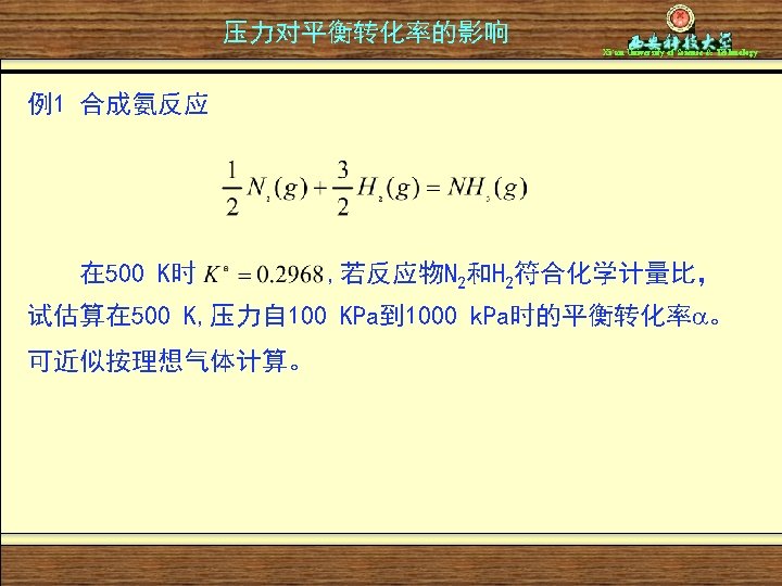 Xian University of Science Technology Xian University of Slides: 29 Download presentation Xi’an University of Science & Technology 第五章 化学平衡 Xi’an University of Science & Technology 有纯凝聚态物质参加的理想气体化学反应 Xi’an University of Science & Technology 为定值时范特霍夫方程的积分式 Xi’an University of Science & Technology 为温度的函数时范特霍夫方程的积分式 Xi’an University of Science & Technology 解:设反应前N 2的物质的量为n 0, 则H 2的物质的量为 3 n 0 t=0, n. B n 0 3 n 0 0 t=t, n. B n 0(1 - ) 3 n 0(1 - ) 2 n 0 t=t, y. B Xi’an University of Science & Technology P/k. Pa 该反应 100 250 0. 1505 0. 2864 500 750 0. 4156 0. 4931 0. 5462 ,则p增大, 必增大 1000 Xi’an University of Science & Technology 反应物的摩尔比对平衡转化率的影响 Xi’an University of Science & Technology Xi’an University of Science & Technology Xi’an University of Science & Technology