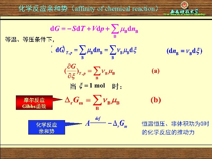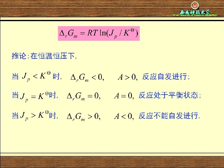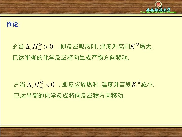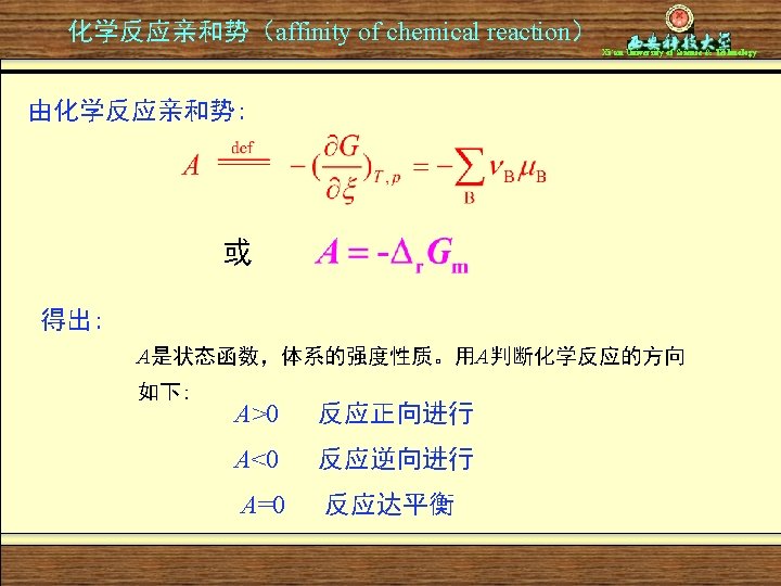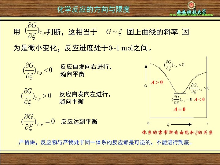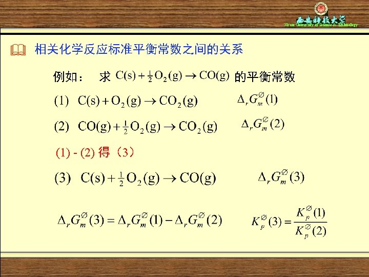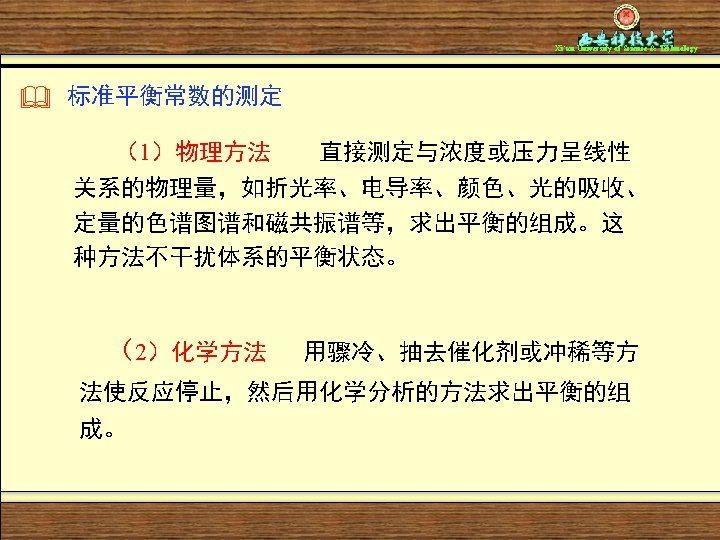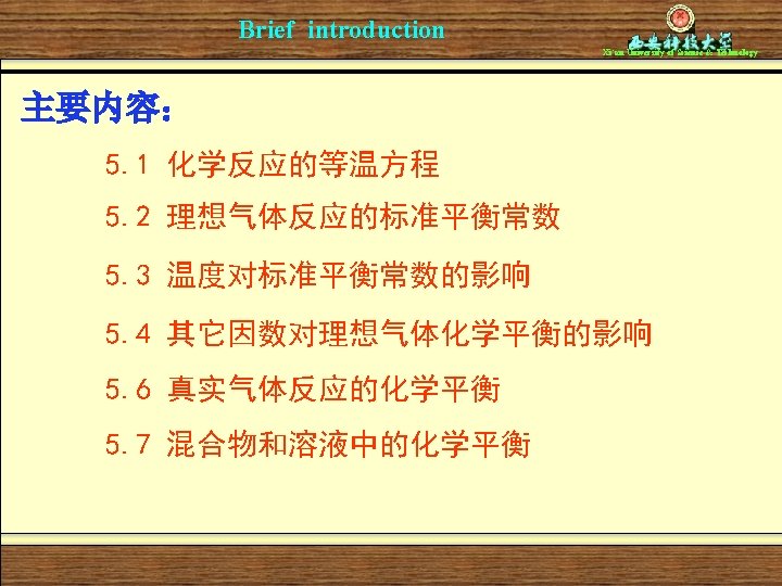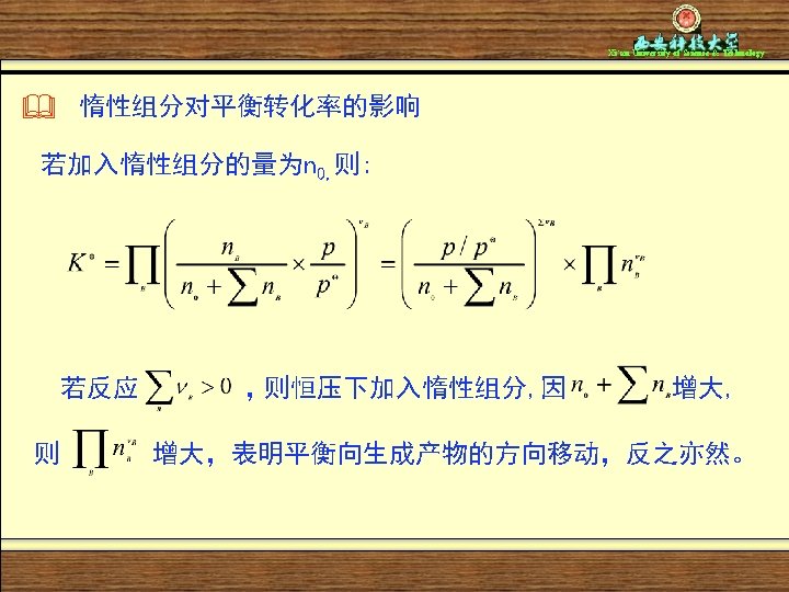 Xian University of Science Technology Xian University of Slides: 29 Download presentation Xi’an University of Science & Technology 第五章 化学平衡 Xi’an University of Science & Technology 有纯凝聚态物质参加的理想气体化学反应 Xi’an University of Science & Technology 为定值时范特霍夫方程的积分式 Xi’an University of Science & Technology 为温度的函数时范特霍夫方程的积分式 Xi’an University of Science & Technology 解:设反应前N 2的物质的量为n 0, 则H 2的物质的量为 3 n 0 t=0, n. B n 0 3 n 0 0 t=t, n. B n 0(1 - ) 3 n 0(1 - ) 2 n 0 t=t, y. B Xi’an University of Science & Technology P/k. Pa 该反应 100 250 0. 1505 0. 2864 500 750 0. 4156 0. 4931 0. 5462 ,则p增大, 必增大 1000 Xi’an University of Science & Technology 反应物的摩尔比对平衡转化率的影响 Xi’an University of Science & Technology Xi’an University of Science & Technology Xi’an University of Science & Technology