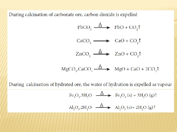 CALCINATION � Calcination is the process in which the concentrated ore is strongly heated in the absence of air. During this process, the water of crystallisation present in the hydrated oxide escapes as moisture. Any organic matter (if present) also get expelled leaving behind a porous ore. This method can also be carried out with a limited supply of air.
