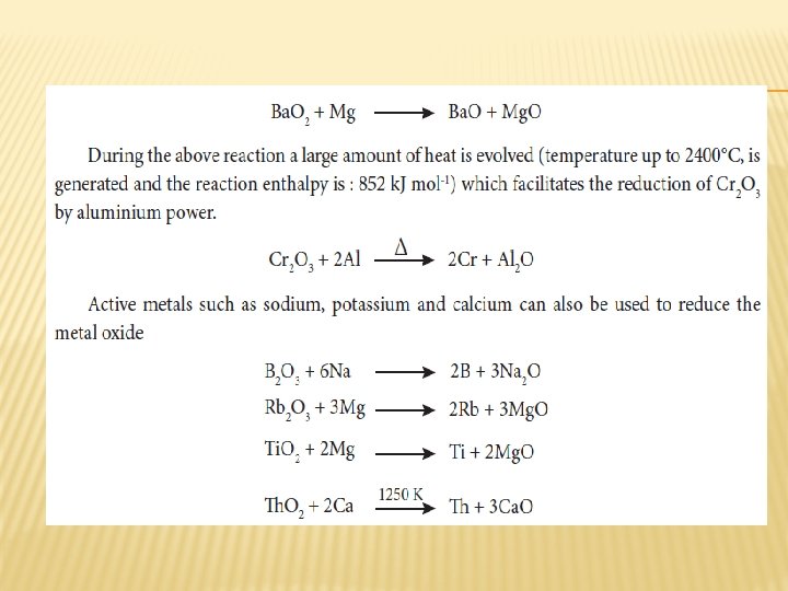 REDUCTION BY METAL � Metallic oxides such as Cr 2 O 3 can be reduced by an aluminothermite process. In this process, the metal oxide is mixed with aluminium powder and placed in a fire clay crucible. To initiate the reduction process, an ignition mixture (usually magnesium and barium peroxide) is used.