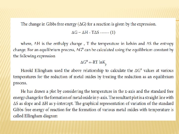 LIMITATIONS OF ELLINGHAM DIAGRAM � Ellingham diagram is constructed based only on thermodynamic considerations. It gives information about thermodynamic feasibility of a reaction. It does not tell anything about the rate of the reaction. More over, it does not give any idea about the possibility of other reactions that might be taking place. � The interpretation of ΔG is based on the assumption that the reactants are in equilibrium with the product which is not always true.