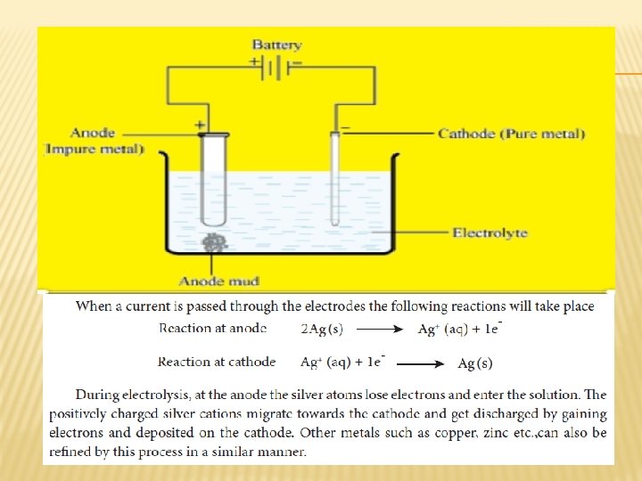 ELECTROLYTIC REFINING The crude metal is refined by electrolysis. It is carried out in an electrolytic cell containing aqueous solution of the salts of the metal of interest. During electrolysis, the less electropositive impurities in the anode, settle down at the bottom and are removed as anode mud. � Cathode : Pure silver � Anode : Impure silver rods � Electrolyte : Acidified aqueous solution of silver nitrate. �