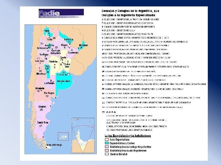 Federación Argentina de la Ingeniería Especializada La FADIE inicia sus actividades en 1992 y adquiere Personería Jurídica en 1997 • Agrupa a todas las “Instituciones de Ley” que gobiernan el ejercicio profesional de las Ingenierías Especializadas, en todo el territorio nacional. • Esta integrada por los denominados Ingenieros Especialistas: Mecánicos, Electricistas, Electromecánicos, Químicos, Electrónicos, Telecomunicación, Metalúrgicos, Higiene y Seguridad, etc. • Se estima en 15. 000 profesionales de las ingenierías especializadas que se encuentran matriculados y en actividad en todo el país.