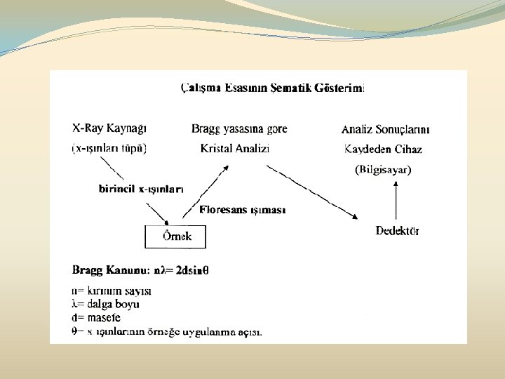 Ø Herhangi bir Xray kaynağından (bu bir Xray tüpü veya radyoaktif kaynak olabilir) salınan X ışınları malzemedeki elektronlara çarparak onları yerlerinden uzaklaştırırlar. Bu çarpışma sonunda boşalan yere bir üst veya daha üstteki yörüngelerden elektronlar doldurur. Bu doldurma esnasında da atoma özgü enerji seviyesine sahip ikincil bir X ışını salınır. Bu olaya X-Ray Floresans kısaca XRF adı verilir.