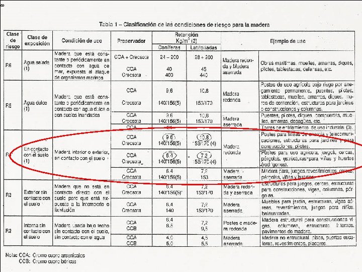 Cuadro comparativo de las características de algunas sustancias preservantes Creosota Óxido de tri N butil estaño Sulfato de cobre CCA Soluble en Sol. Orgánicos Agua Acción I. - F. - P. m. Fungicida I. - F. - P. m. Corrosión No No Si No Permanencia Alta Media (lixivia) Alta Dosis de uso 50 a 100 % 0, 5 % 3 a 5% 1 a 2 % Toxicidad irritante No Muy tóxico
