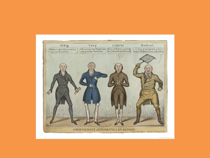 Four figures give their views on reform; • a Whig, Charles Grey (1764 -1845) says ‘Reform is absolutely necessary to prevent Revolution’; • a Tory, the Duke of Wellington (1769 -1852) says ‘I do maintain that Reform means nothing else than Revolution’; • a Liberal, possibly John Lee (1802 -74) says ‘A Leetle Reform is wanting but fiddlededee about Revolution’; • a Radical, William Cobbett (1763 -1835) brandishing a gridiron says ‘I say if we don’t have a Real Radical Reform we’ll have a Revolution’; 1831
