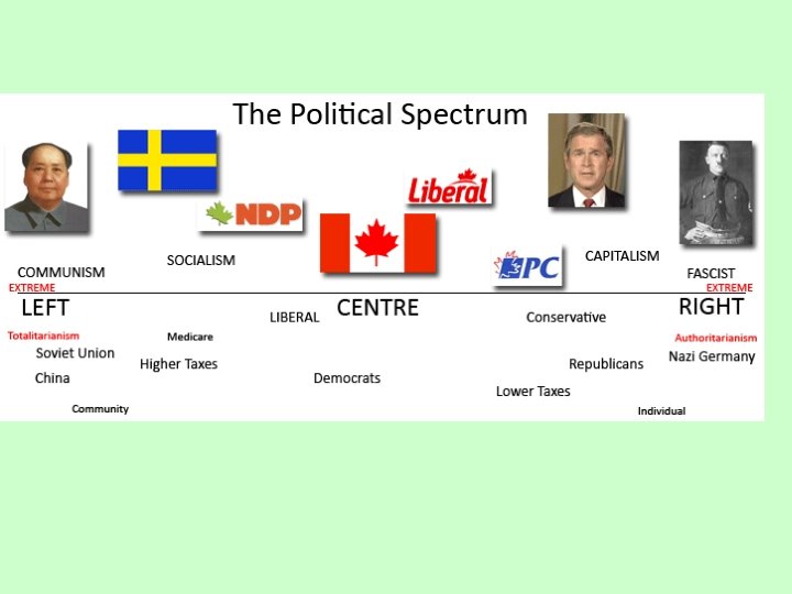 Le totalitarisme/L’absolutisme • Catégorie: Une forme de gouvernement • Caractéristiques: - Une dictature, une personne a le pouvoir ‘absolu’ Exemples: La Russie (communiste), L’Allemagne nazie (fasciste) Comparisons? Le fascisme, le nazisme, le communisme