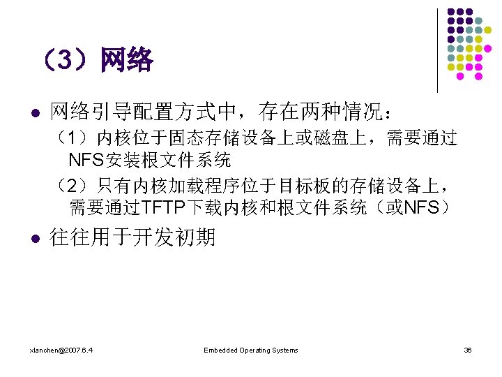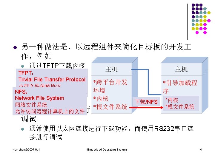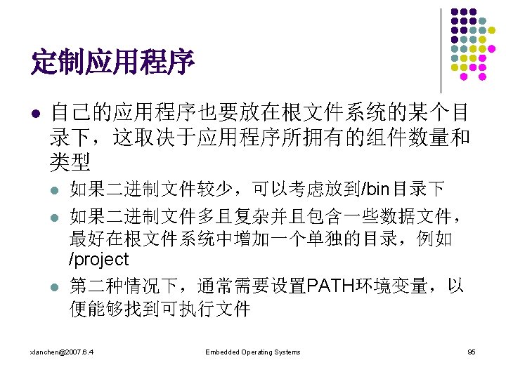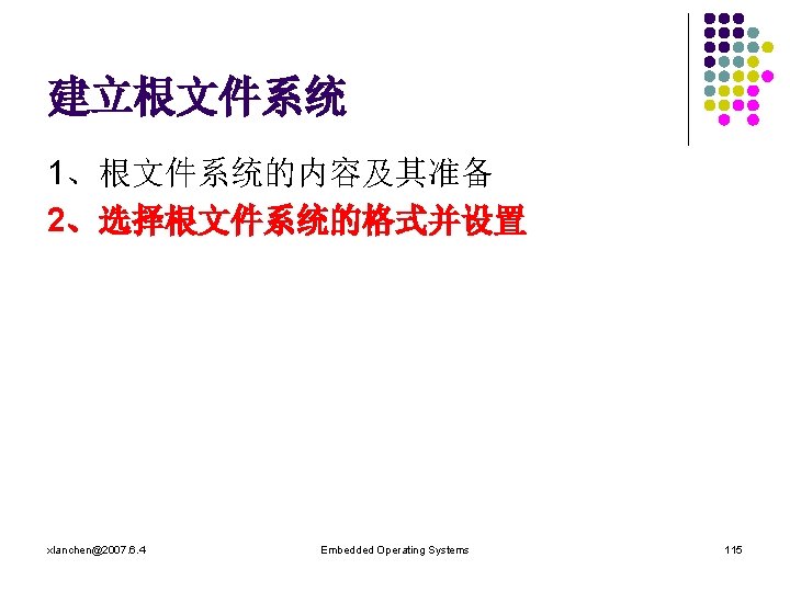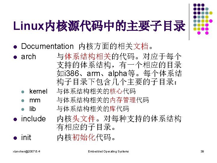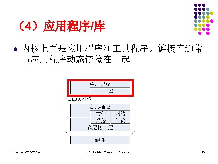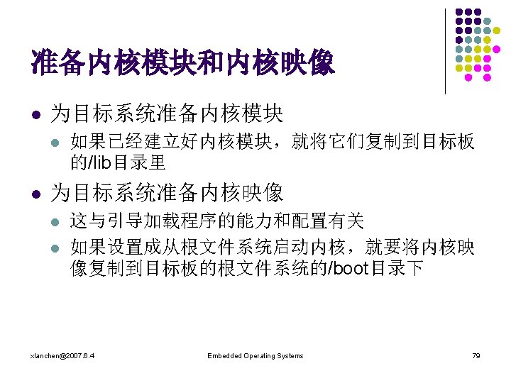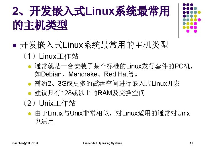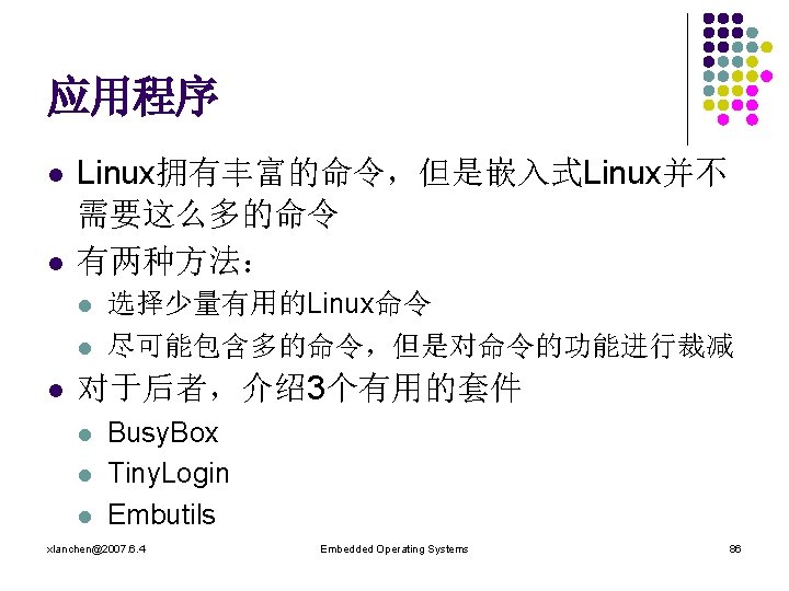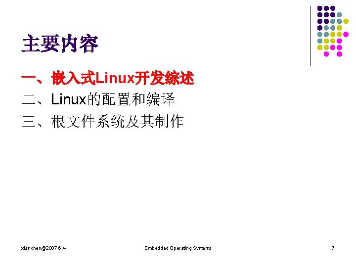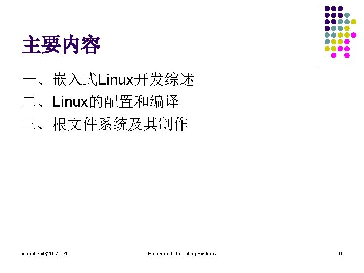 本次课的主要内容 l 嵌入式Linux开发技术 xlanchen@2007. 6. 4 Embedded Operating Systems 4