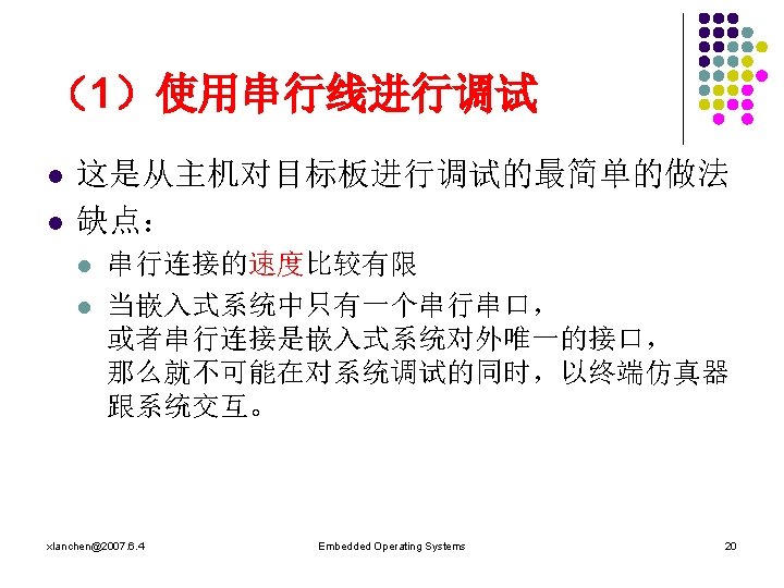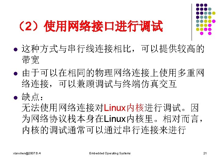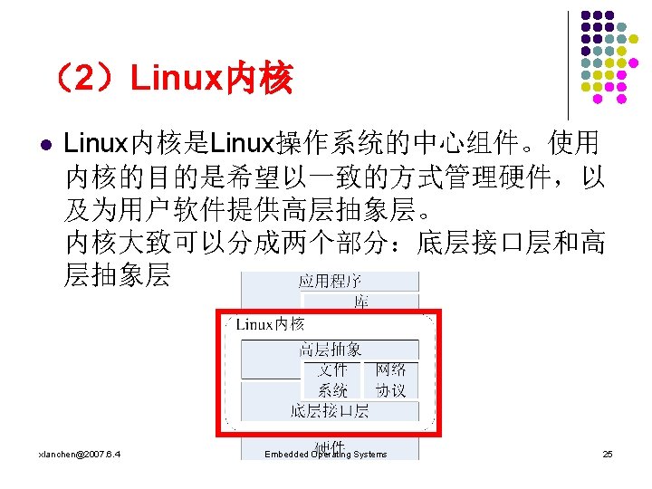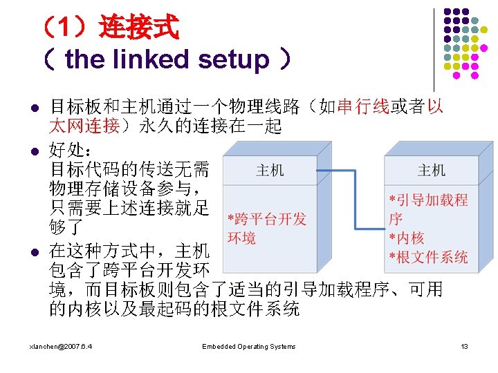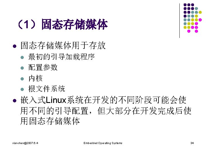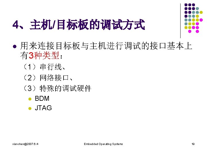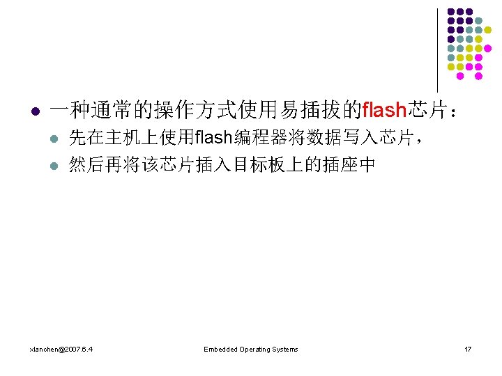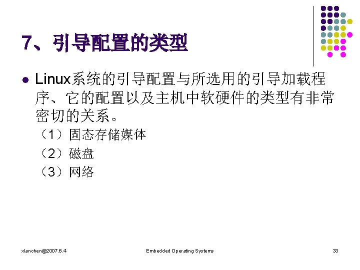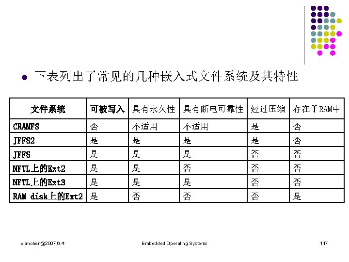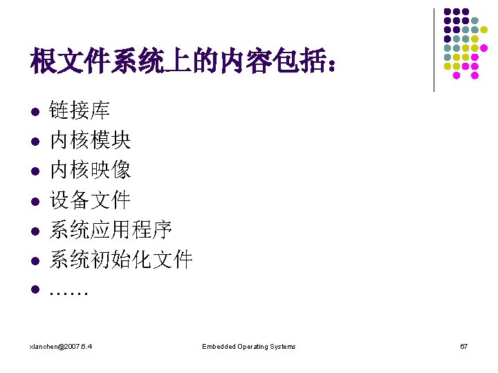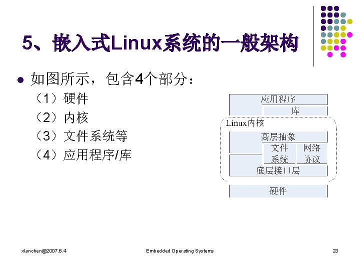 本次课的主要内容 l 嵌入式Linux开发技术 xlanchen@2007. 6. 4 Embedded Operating Systems 4