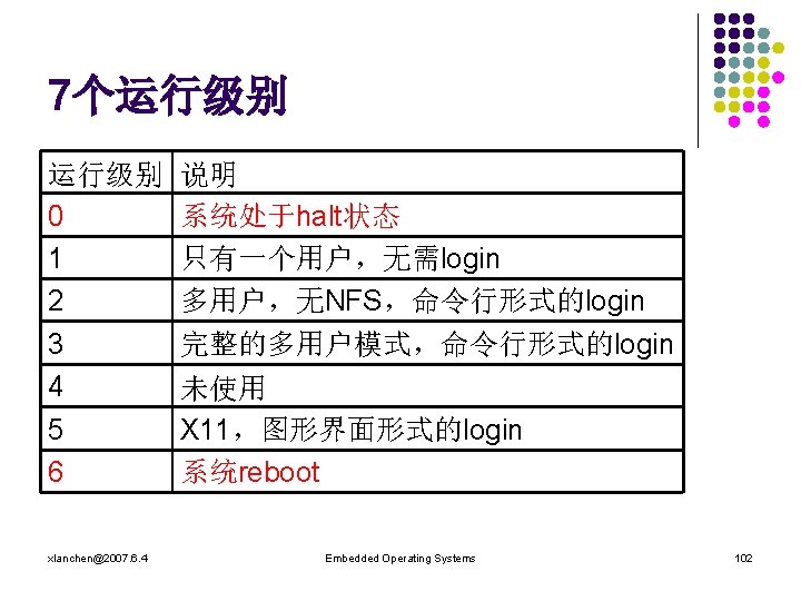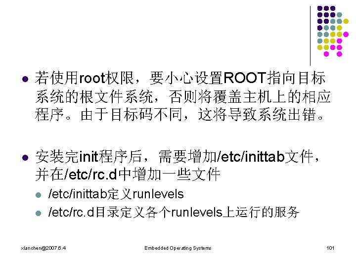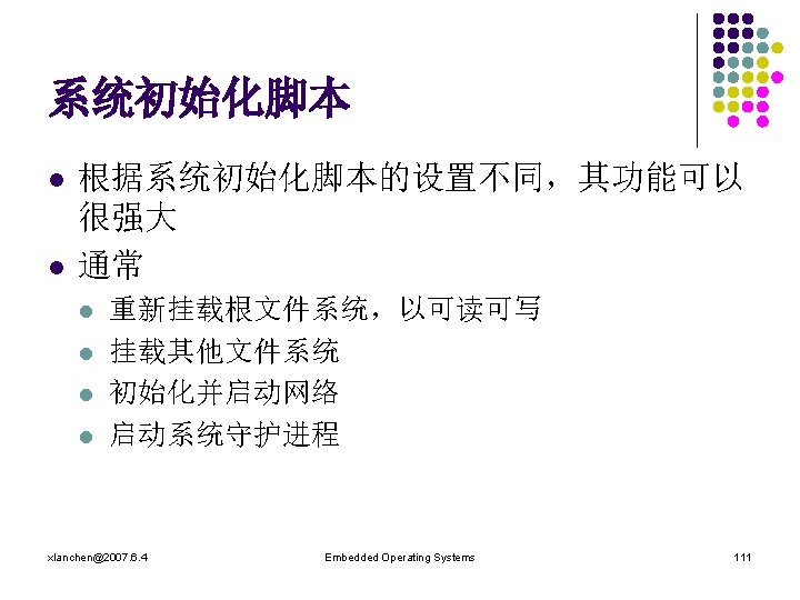 l 一个可能的inittab如下 (id和runlevel都为空) : : sysinit: /etc/init. d/rc. S 设置/etc/init. d/rc. S作为系统初始化文件 : : respawn: /sbin/getty 115200 tty. S 0 : : respawn: /control-module/bin/init 在串口( 115200波特率)启动一个登录会话 : : restart: /sbin/init启动控制模块定制的系统初始化脚本 设置/sbin/init为重启时运行的命令 : : shutdown: /bin/umount -a -r 系统关闭时,运行umount xlanchen@2007. 6. 4 Embedded Operating Systems 110