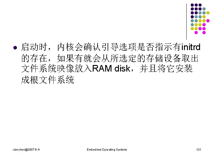l 接下来,就可以将initrd. img挂载到刚刚建立的 mount点上 l 当然,此时文件系统中基本上是空的 xlanchen@2007. 6. 4 Embedded Operating Systems 126