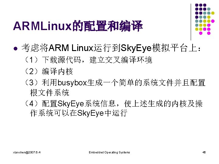 l 进入armlinux 4 skyeye l installguide. txt xlanchen@2007. 6. 4 Embedded Operating Systems 52