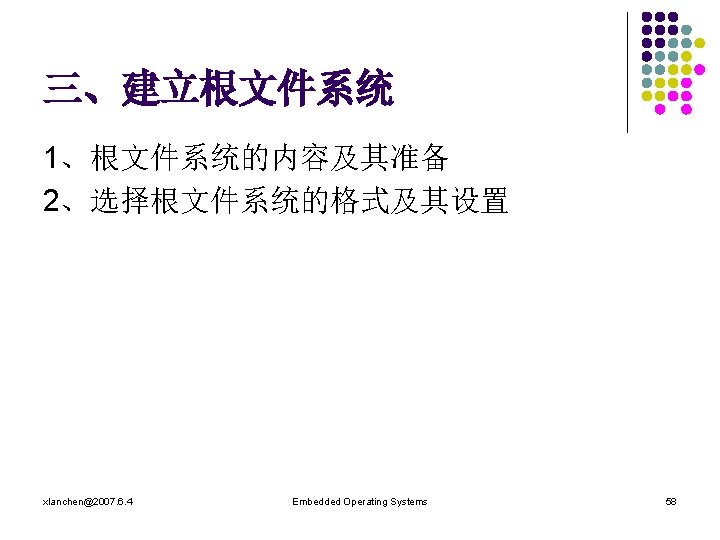 主要内容 一、嵌入式Linux开发综述 二、Linux的配置和编译 三、根文件系统及其制作 xlanchen@2007. 6. 4 Embedded Operating Systems 57