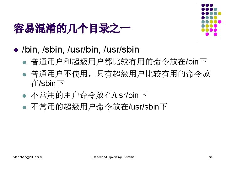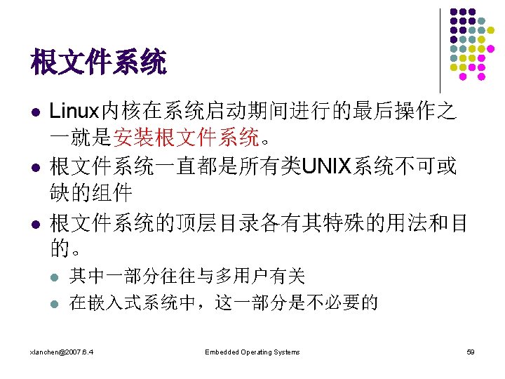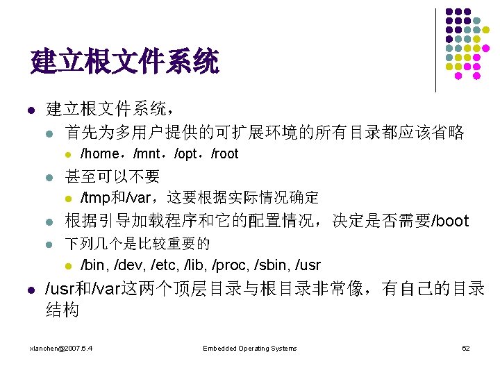 l 根文件系统中的内容由FHS(Filesystem Hierarchy Standard,文件系统层次标准) 制 定 l 制定该标准的组织为FHSG(FHS Group, http: //www. pathname. com/fhs/) xlanchen@2007. 6. 4 Embedded Operating Systems 60