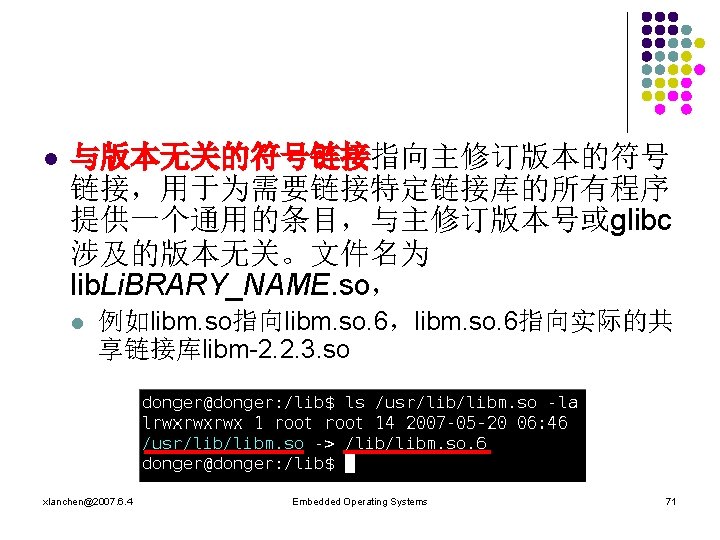 l 主修订版本的符号链接,文件名为 lib. LIBRARY_NAME. so. MAJOR_REVISION_VE RSION l 例如实际的数学链接库libm-2. 5. so, 其符号连接的名称为libm. so. 6 xlanchen@2007. 6. 4 Embedded Operating Systems 70