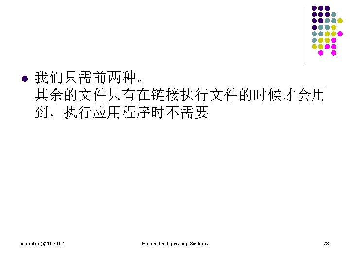 l 静态链接库包文件, 文件名格式为 lib. LIBRARY_NAME. a, 如动态装载库libdl的静 态包文件就是libdl. a xlanchen@2007. 6. 4 Embedded Operating Systems 72