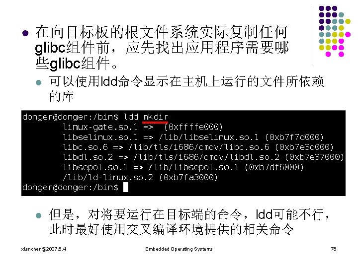 l 动态链接器的符号链接 l 对于i 386、arm或m 68 k,通常为 ld-linux. so. MAJOR_REVISION_VERSION l 对于MIPS或PPC,则通常为 ld. so. MAJOR_REVISION_VERSION xlanchen@2007. 6. 4 Embedded Operating Systems 75