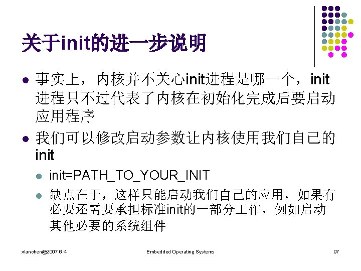 3、Init进程 l 启动各种应用程序(根据设置) xlanchen@2007. 6. 4 Embedded Operating Systems 32