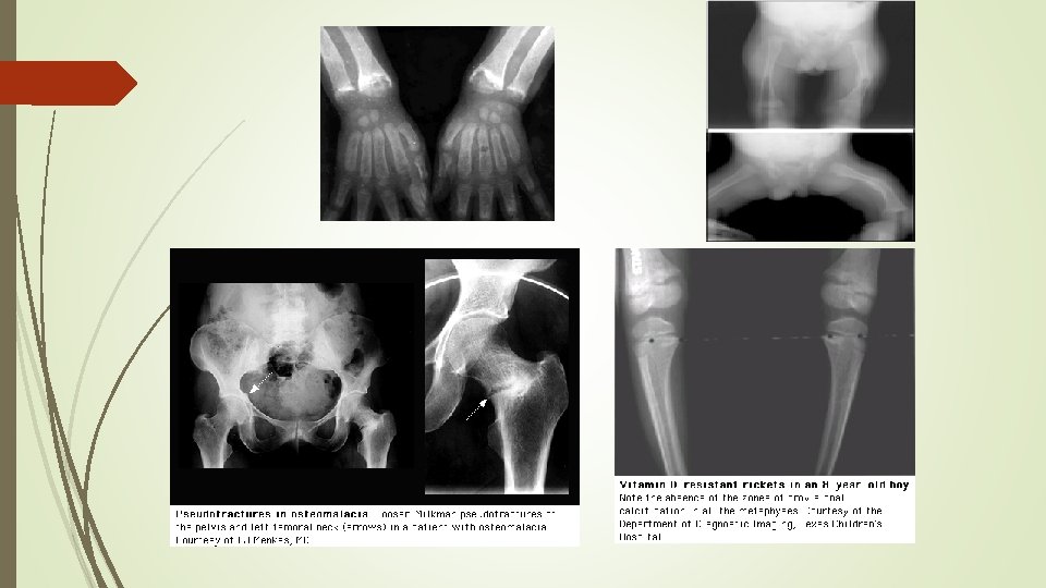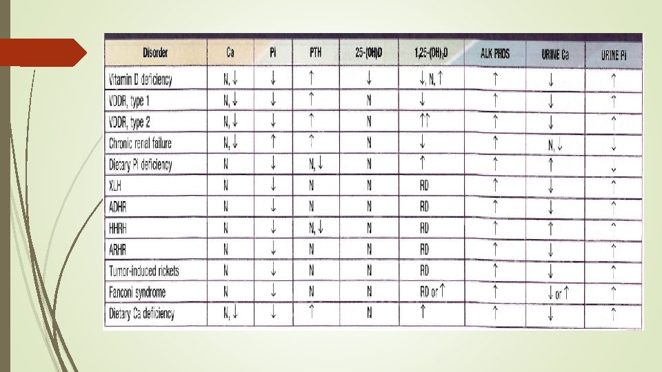 Biochemical findings in rickets Alkaline phosphatase usually is ↑in all forms of rickets. Serum phosphorus concentrations usually are↓ in both hypocalcemic and hypophosphatemic rickets. Serum Ca is ↓only in hypocalcemic rickets. Serum parathyroid hormone typically is ↑in hypocalcemic rickets, in contrast it is N in hypophosphatemic rickets. 25 -OH vitamin D reflect the amount of vitamin D stored in the body, and is ↓in vit D deficiency. 1, 25 -OH 2 vitamin D can be↓, N or ↑in hypocalcemic rickets and usually is N or slightly ↑in hypophosphatemic rickets.