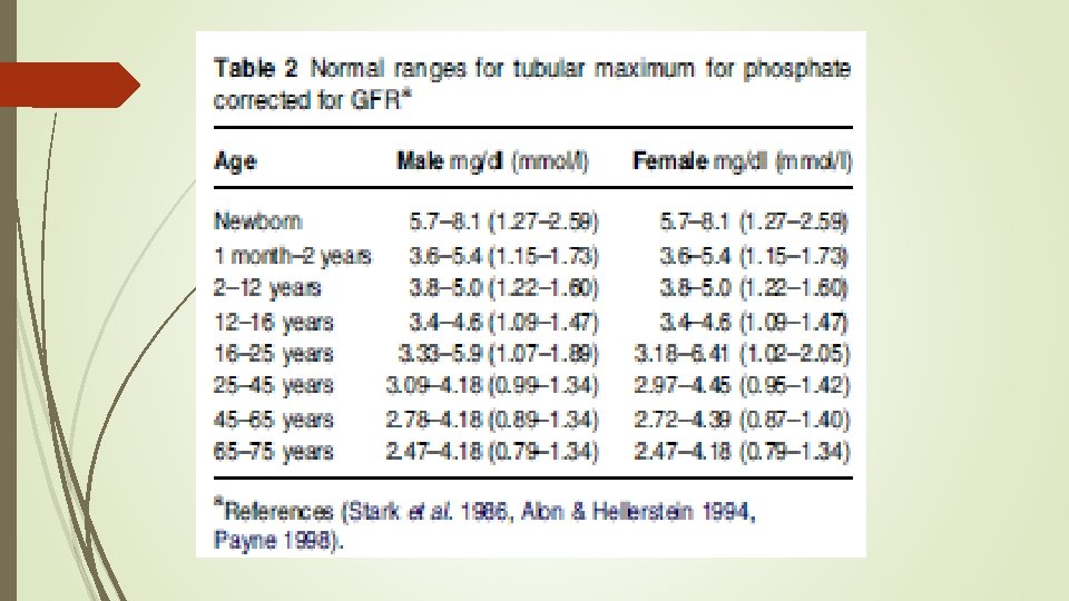 evaluate urinary phosphate wasting Ø tubular maximum for phosphate corrected for GFR(Tm. P/GFR) Ø tubular reabsorption of phosphate (%TRP) can be calculated at any time using the following formula: