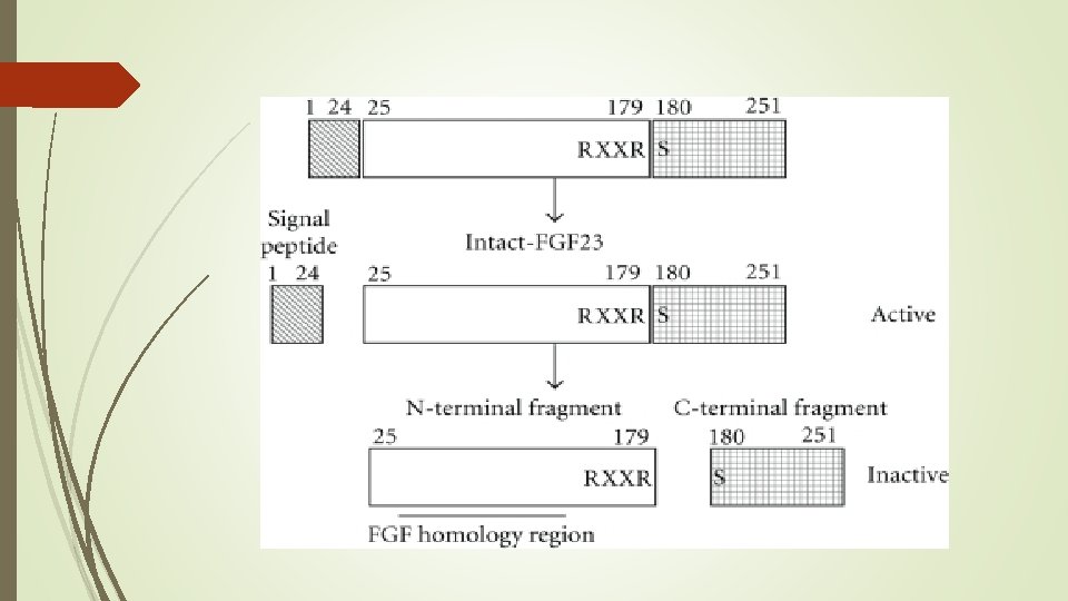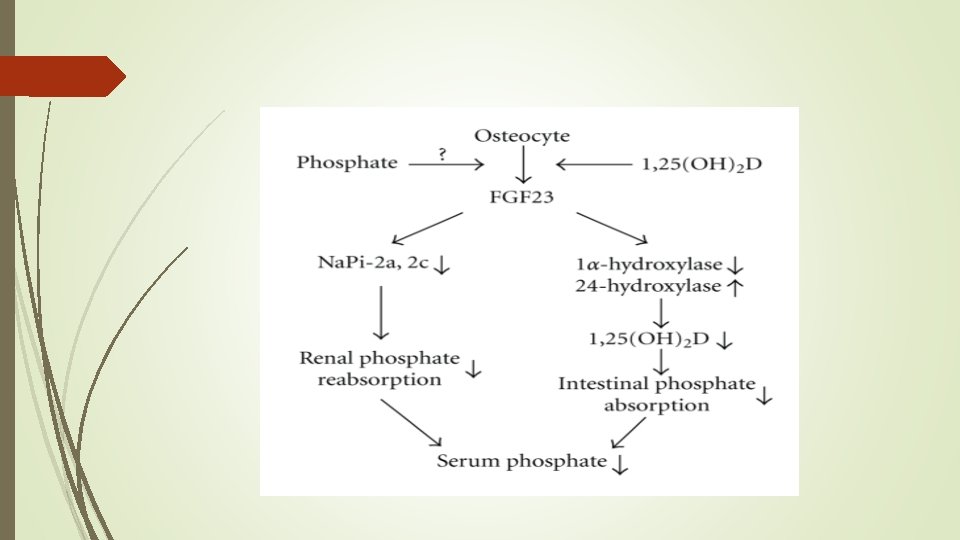 Phosphatonin Ø Fibroblast growth factor-23 (FGF-23) is the most well characterized phosphatonin. Ø It is a humoral mediator that decreases renal tubular reabsorption of phosphate and decreases the activity of renal 1α-hydroxylase