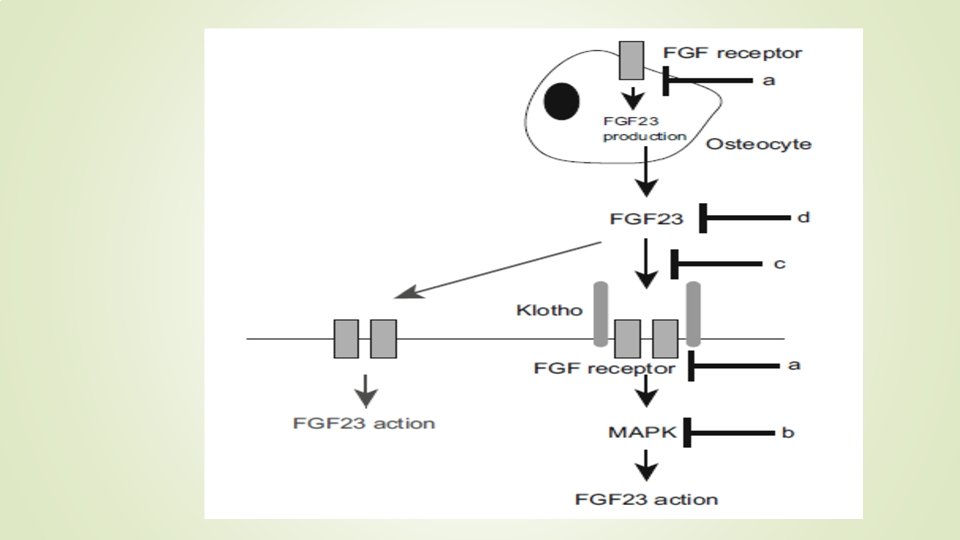 These findings suggest that FGF 23 -FGF receptor/Klotho pathway can be a new drug target for disorders of mineral and bone metabolism several preclinical studies indicated that the inhibition of FGF 23 activities may be useful for hypophosphatemic diseases caused by excessive actions of FGF 23