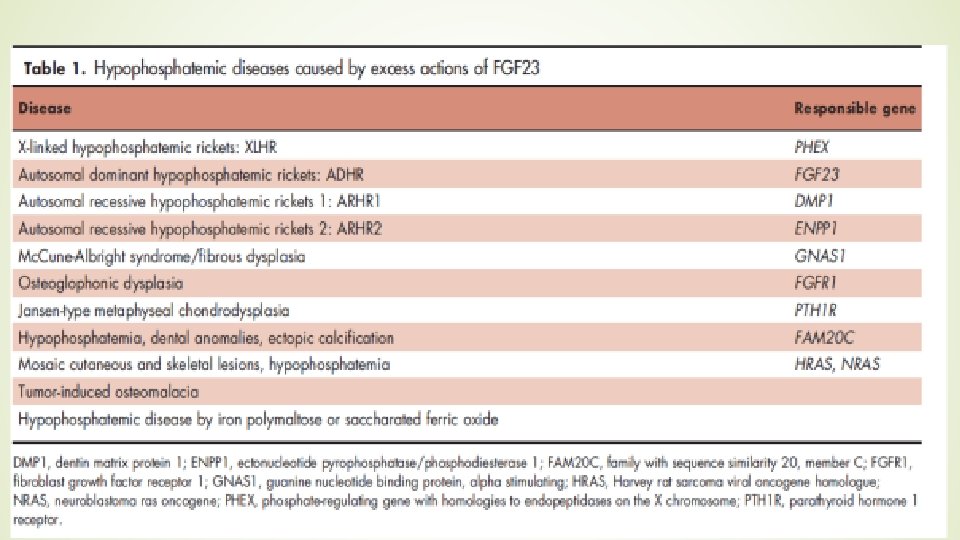 ØThe disorder has been divided into three subtypes: ØARHR 1 is caused by inactivating mutations in the DMP 1 gene, which encodes Dentin matrix protein 1; ØARHR 2 is caused by an inactivating mutation in the ENPP 1 gene, which encodes ectonucleotide pyrophosphatase/ phosphodiesterase 1 Ø AHRH 3 is associated with mutations in the FAM 20 C gene encoding a protein kinase. Ø mutations result in increased FGF 23 protein production and defective osteocyte maturation.