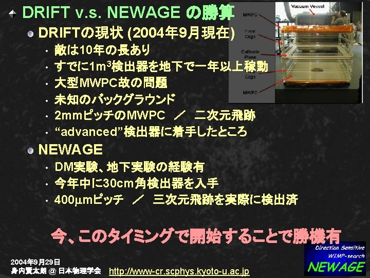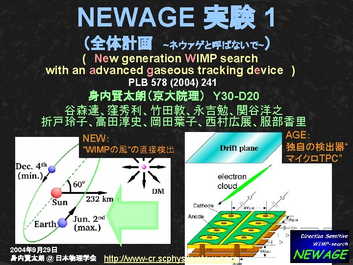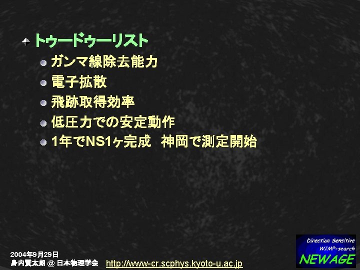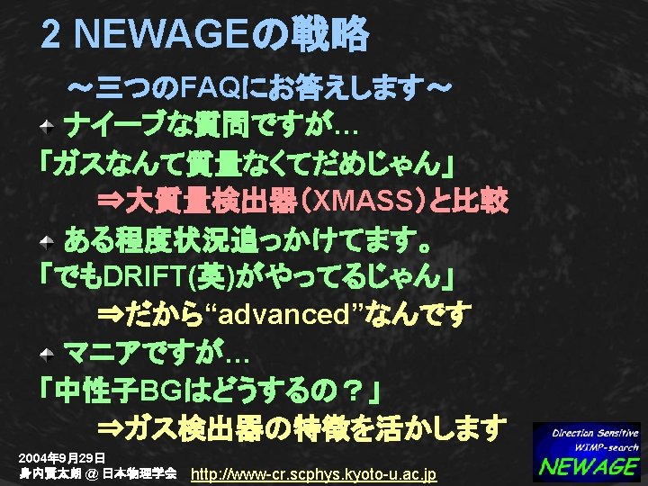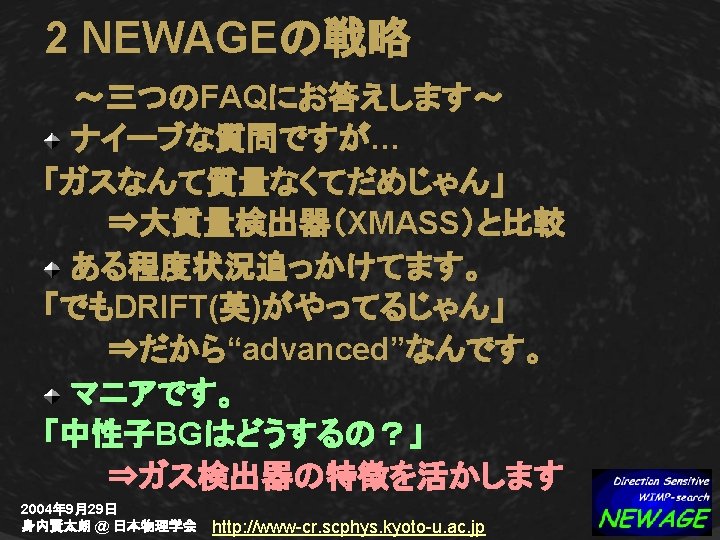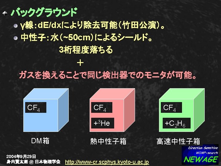 XMASS-NEWAGE (2) 感度:XMASS 1 t ⇔ NEWAGE 1 kg SD SI 容積:Liq Xe 1 tの安全バッファー ~ 170 m 3 CF 4 ガス(30 torr)F 1 kg ~ 7. 5 m 3 Complementary & Comparable 2004年 9月29日 身内賢太朗 @ 日本物理学会 http: //www-cr. scphys. kyoto-u. ac. jp