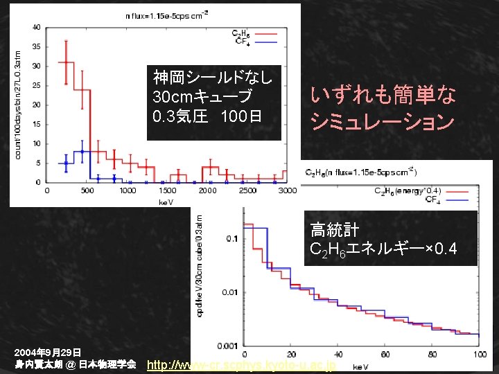 Background rejection Particle I. D. (DM: nucleus BG-gamma: electron) >95% gamma-ray rejection (very preliminary study) χ2/d. o. f 22 Na (γ) d. E/d. X [ke. V/cm] 252 Cf (n+γ) nucleus event d. E/d. X [ke. V/cm] Experimental results 2004年 9月29日 身内賢太朗 @ 日本物理学会 2 mm c. f. 25 ke. V electron:>10 cm Simulations (25 ke. V F ion in 20 Torr CF 4) http: //www-cr. scphys. kyoto-u. ac. jp