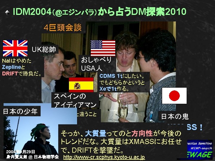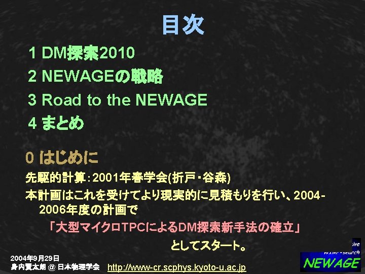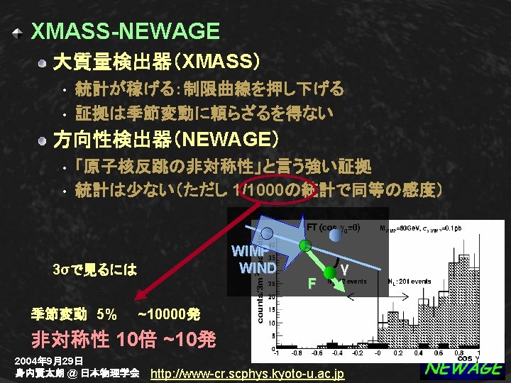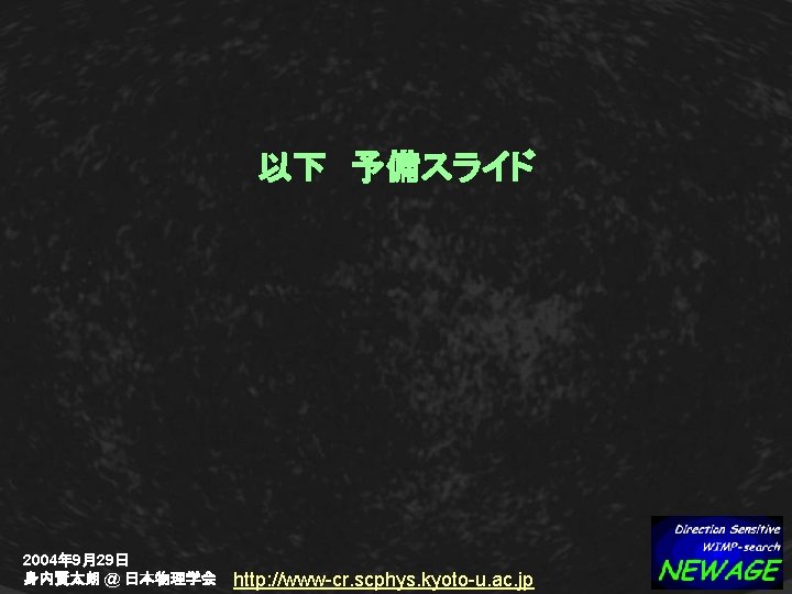 3. NEWAGE : DM search with m-TPC Expected WIMP-signals Recoil angle distribution WIMP Forward-backward asymmetry WIND Simulation conditions: Kamioka 50 water shield g-ray BG 100% rejected CF 4 20 Torr track>3 mm Eth=25 ke. V hatched:WIMP painted:neutron BG 2004年 9月29日 身内賢太朗 @ 日本物理学会 http: //www-cr. scphys. kyoto-u. ac. jp F γ