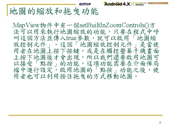 xml version1 0 encodingutf8 Linear Layout Spinner com Slides: 10 Download presentation 地圖的縮放和拖曳功能 介面佈局檔 <? xml version="1. 0" encoding="utf-8"? > <Linear. Layout … > <Spinner … /> <com. google. android. maps. Map. View android: id="@+id/map" … android: clickable="true" /> </Linear. Layout> 4 地圖的縮放和拖曳功能 程式碼 public class Main extends Map. Activity { … public void on. Create(Bundle saved. Instance. State) { … } private void setup. View. Component() { … m. Map. Ctrl = m. Map. View. get. Controller(); m. Map. View. set. Built. In. Zoom. Controls(true); m. Map. Ctrl. set. Zoom(18); … } 5 加上鍵盤控制功能 在on. Key. Down()中請輸入以下粗體標示的程式碼 public boolean on. Key. Down(int key. Code, Key. Event event) { int next. Zoom, zoom; switch (key. Code) { case Key. Event. KEYCODE_I: next. Zoom = m. Map. View. get. Zoom. Level() + 1; zoom = next. Zoom > m. Map. View. get. Max. Zoom. Level() ? m. Map. View. get. Max. Zoom. Level() : next. Zoom; m. Map. Ctrl. set. Zoom(zoom); break; case Key. Event. KEYCODE_O: next. Zoom = m. Map. View. get. Zoom. Level() - 1; zoom = next. Zoom < 1 ? 1 : next. Zoom; m. Map. Ctrl. set. Zoom(zoom); break; } return super. on. Key. Down(key. Code, event); 7 }