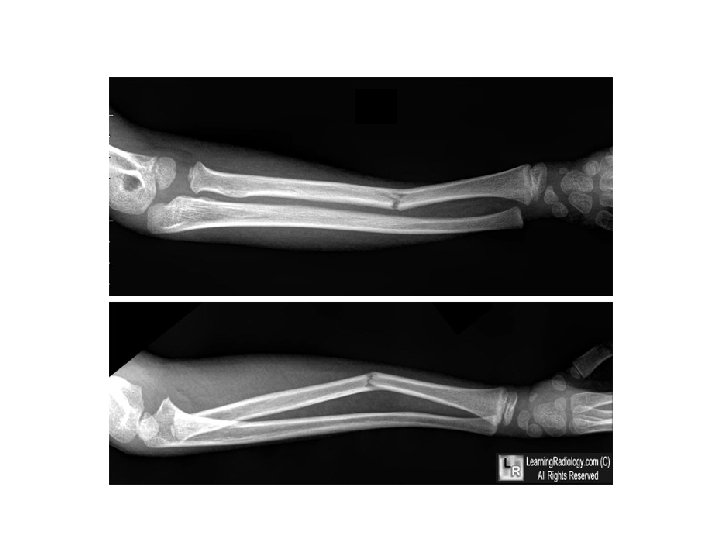 ANSWER • There are 2 fractures on this film • Closed distal radius fracture with complete displacement. Also there is an ulnar styloid fracture which is also displaced • The displacement is especially prominent on the lateral view highlighting the importance of multiple views. • There may be intra-articular involvement as joint space is close by • Remember, remove all jewelry from extremity fractures