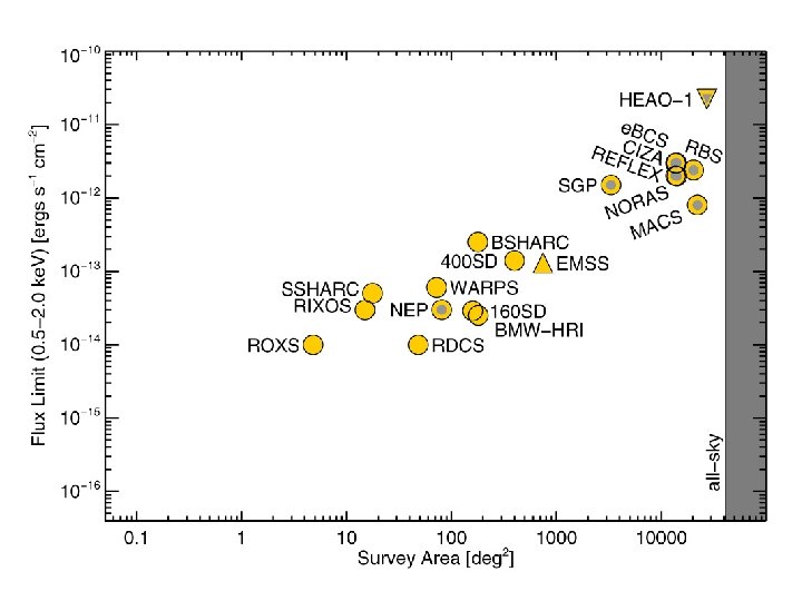 ROSAT Surveys Recently Finished / Ongoing u 400 SD (Vikhlinin et al. ) – – Optical follow-up is complete (paper in prep) fx > 1. 4 x 10 -13 (higher than 160 SD) Includes 100 bright 160 SD cluster + 200 new clusters 50 clusters at z>0. 4 (zmax = 0. 899, previously discovered) – Chandra LP (43 clusters at z>0. 35 cosmology)