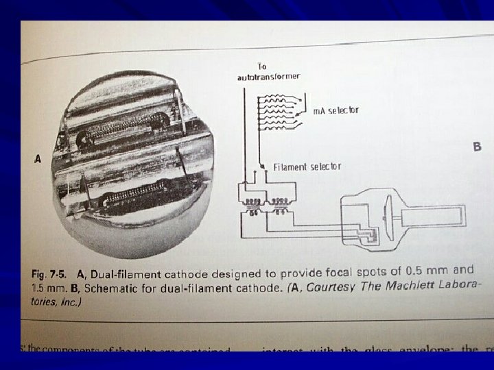 The Filaments Most tube have two filaments which provide a large focal area and a small focal area Two foci provide the choice of quick exposures or high resolution. The filaments are made of thoriated tungsten.