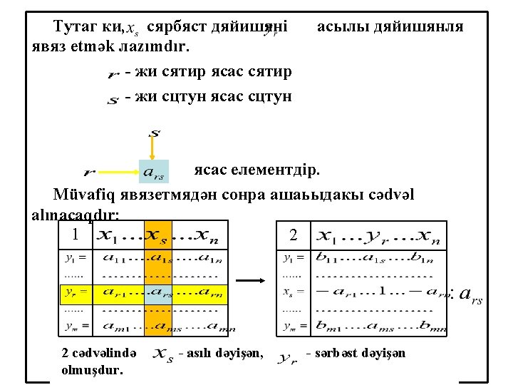 Jordan əvəzetmələri Tənliklər sistemi: - sərbəst dəyişənlər - asılı dəyişənlər Sistemin cədvəl forması