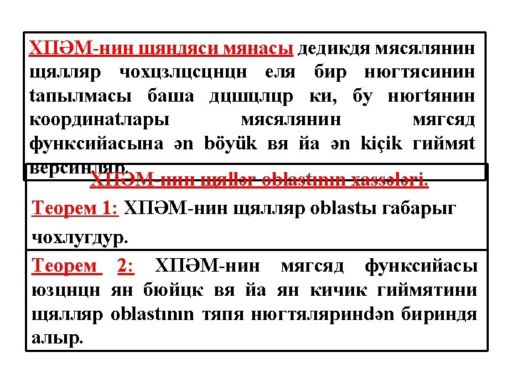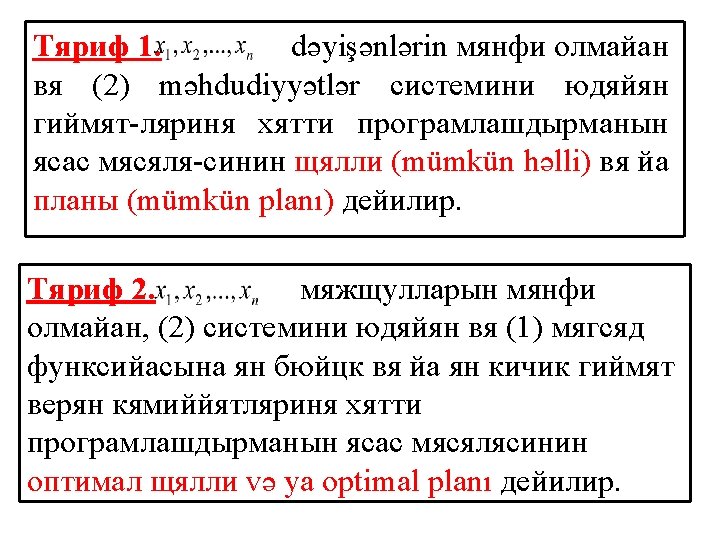 Xətti proqramlaşdırmanın əsas məsələsinin qoyuluşu. Plan: 1. Xətti cəbrin elementləri və onların xətti proqramlaşdırmada tətbiqi. 2. XPƏM-nin ifadə edilməsi. Əsas anlayışlar. 3. XPƏM-nin yazılış formaları. 4. XPƏM-nin həndəsi izahı. 5. XPƏM-nin iqtisadi izahı.