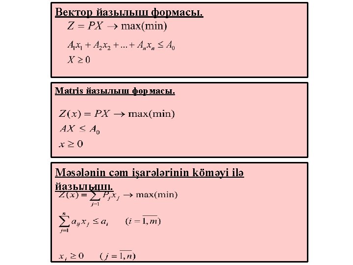 Məsələnin açıq şəkildə yazılışı Vektor yazılış forması XPƏM-nin yazılış formaları Matris yazılış forması Məsələnin cəm işarələrinin köməyi ilə yazılışı Yuxarıda verilmiş (1)-(3) məsələsi XPƏM-nin açıq şəkildə yazılış forması hesab edilir