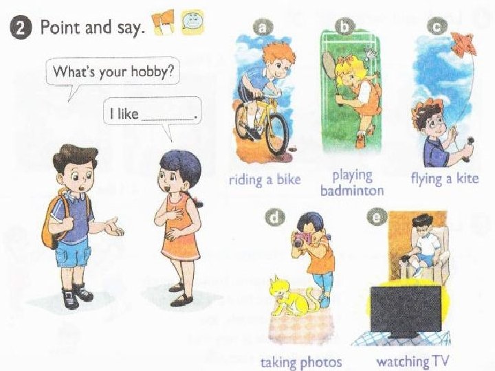 Unit 7: What do you like doing? Lesson 2 P 1 New words : - flying a kite - riding a bike - watching TV - playing badminton/guitar/piano - taking photos - singing Sentence : What’s your hobby ? I like …flying kite….