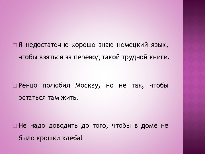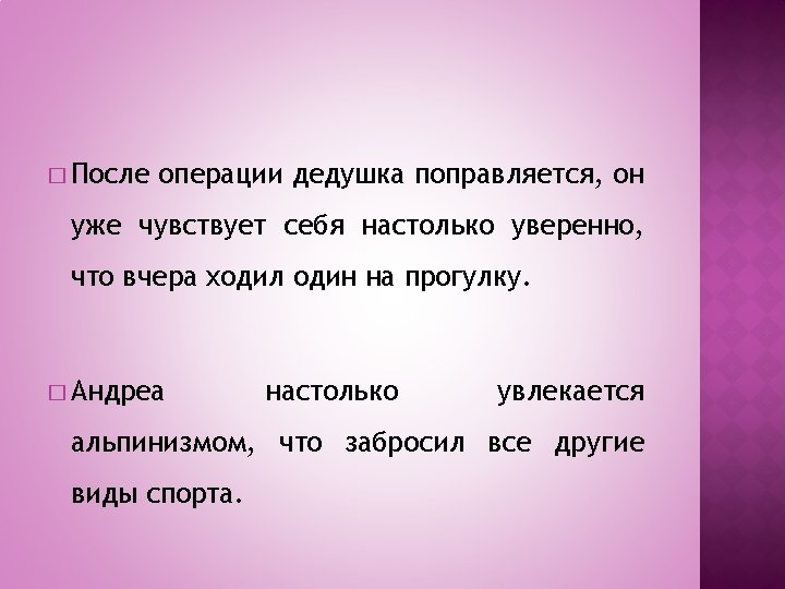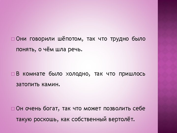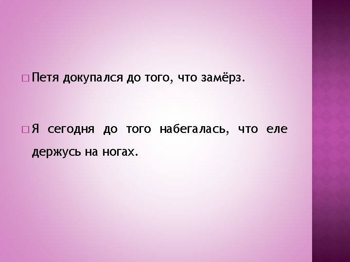 � Quando la dipendente che esprime la CONSEGUENZA, il risultato di ciò di cui si parla nella principale è introdotta dalla congiunzione ТАК ЧТО, sempre preceduta da virgola, è considerata una dipendente consecutiva – ПРИДАТОЧНОЕ ПРЕДЛОЖЕНИЕ СЛЕДСТВИЯ. � La consecutiva non inizia mai il periodo.